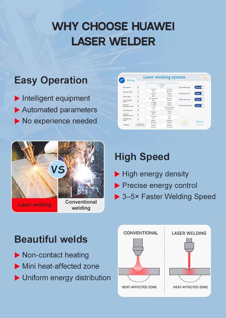 4. Łatwa obsługa i nauka: Ręczne spawanie laserowe jest proste i łatwe do nauczenia, oszczędza koszty pracy i nadaje się do szybkiego szkolenia i wprowadzenia.