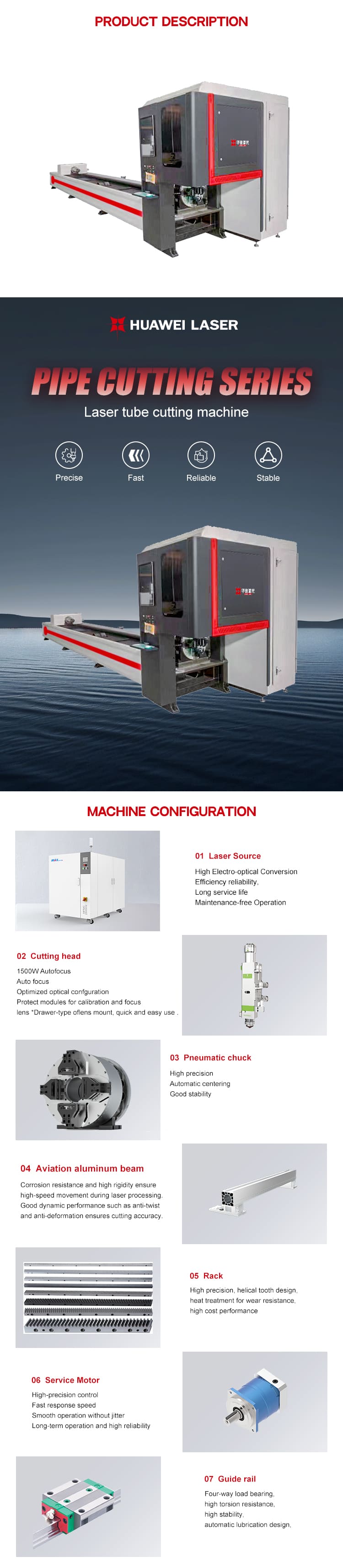 Wysoce precyzyjna maszyna do cięcia laserem światłowodowym z podwójnym uchwytem HUAWEI LASER 6000 W jest przeznaczona do wydajnej i dokładnej obróbki okrągłych, kwadratowych i nieregularnych rur metalowych. System podwójnego uchwytu zapewnia stabilne mocowanie, minimalne wibracje i precyzyjny obrót podczas cięcia z dużą prędkością. Wyposażona w wysokowydajne źródło lasera światłowodowego i inteligentne oprogramowanie sterujące, zapewnia czyste cięcia, gładkie krawędzie i doskonałą powtarzalność. Maszyna do cięcia laserem światłowodowym HUAWEI LASER z podwójnym uchwytem to zaawansowana ręczna spawarka laserowa, będąca alternatywą, zaprojektowaną specjalnie do wysokowydajnej obróbki rur i rurek. Wyposażony w podwójne uchwyty pneumatyczne zapewnia stabilne mocowanie, automatyczne centrowanie i precyzyjny obrót, zapewniając płynne i dokładne cięcie okrągłych, kwadratowych i nieregularnych rur metalowych. Źródło lasera światłowodowego o dużej mocy zapewnia dużą prędkość cięcia, czyste krawędzie i minimalne odkształcenia termiczne. Zaprojektowany z myślą o produkcji metali, produkcji mebli, sprzętu fitness i podzespołów samochodowych, system cięcia rur HUAWEI LASER zapewnia wyjątkową dokładność, niezawodność i produktywność w nowoczesnych zastosowaniach przemysłowych. Maszyna ta obsługuje automatyczny załadunek, zoptymalizowane ścieżki cięcia i szybkie przełączanie materiałów, dzięki czemu idealnie nadaje się do produkcji mebli, sprzętu fitness, rur konstrukcyjnych i niestandardowej produkcji metali. Zapewnia dużą niezawodność i stałą produktywność w zastosowaniach związanych z obróbką rur.